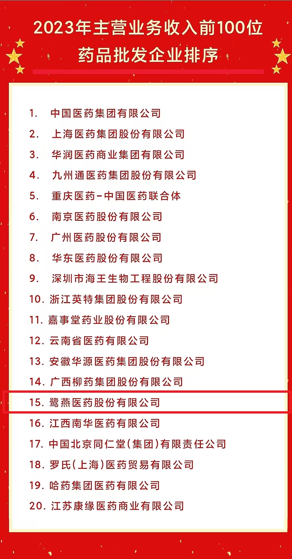 鹭燕医药荣登2023年药品批发企业主营业务收入第15位!