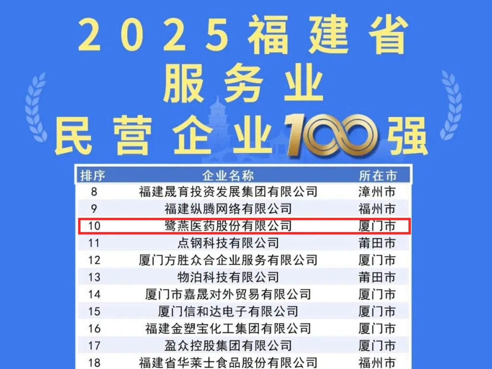 9月28日,福建省工商业联合会在宁德发布“2025福建民营企业100强”,鹭燕医药连续5年上榜,列第26位。同时,在“2025福建省服务业民营企业100强”榜单上,鹭燕医药连续3年上榜,位居第10位。