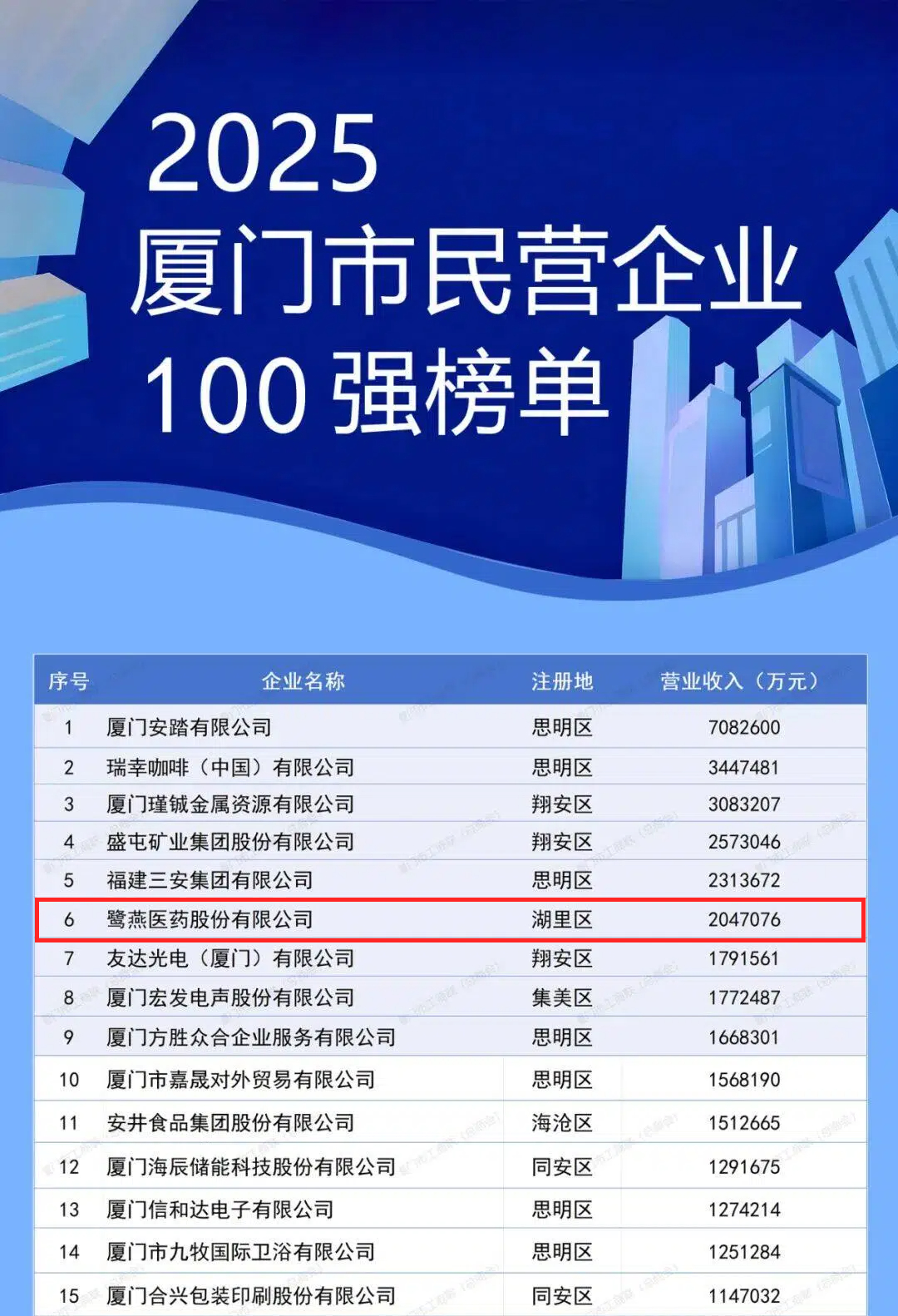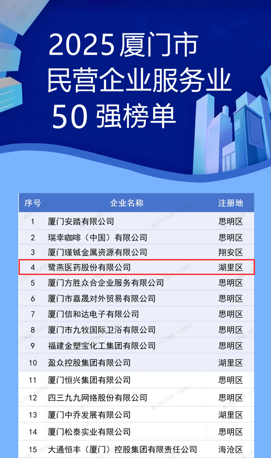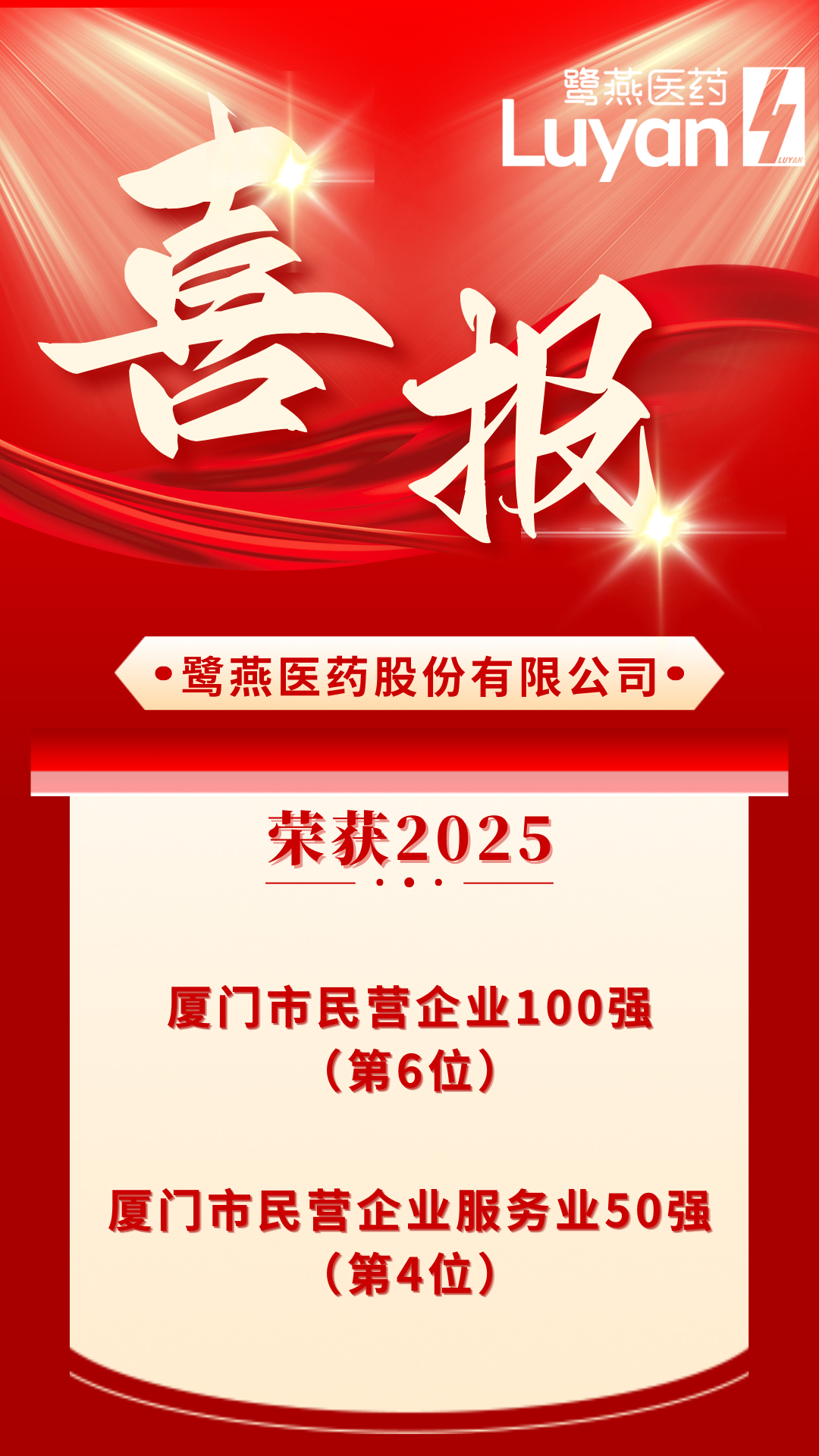 11月1日上午,2025年厦门企业家日大会召开。大会发布了2025厦门市民营企业100强系列榜单,介绍了厦门市民营经济发展态势和营商环境建设成效。鹭燕医药股份有限公司凭借上市企业综合实力,荣膺“2025厦门市民营企业100强”第6位,以及“2025厦门市民营企业服务业50强”第4位。