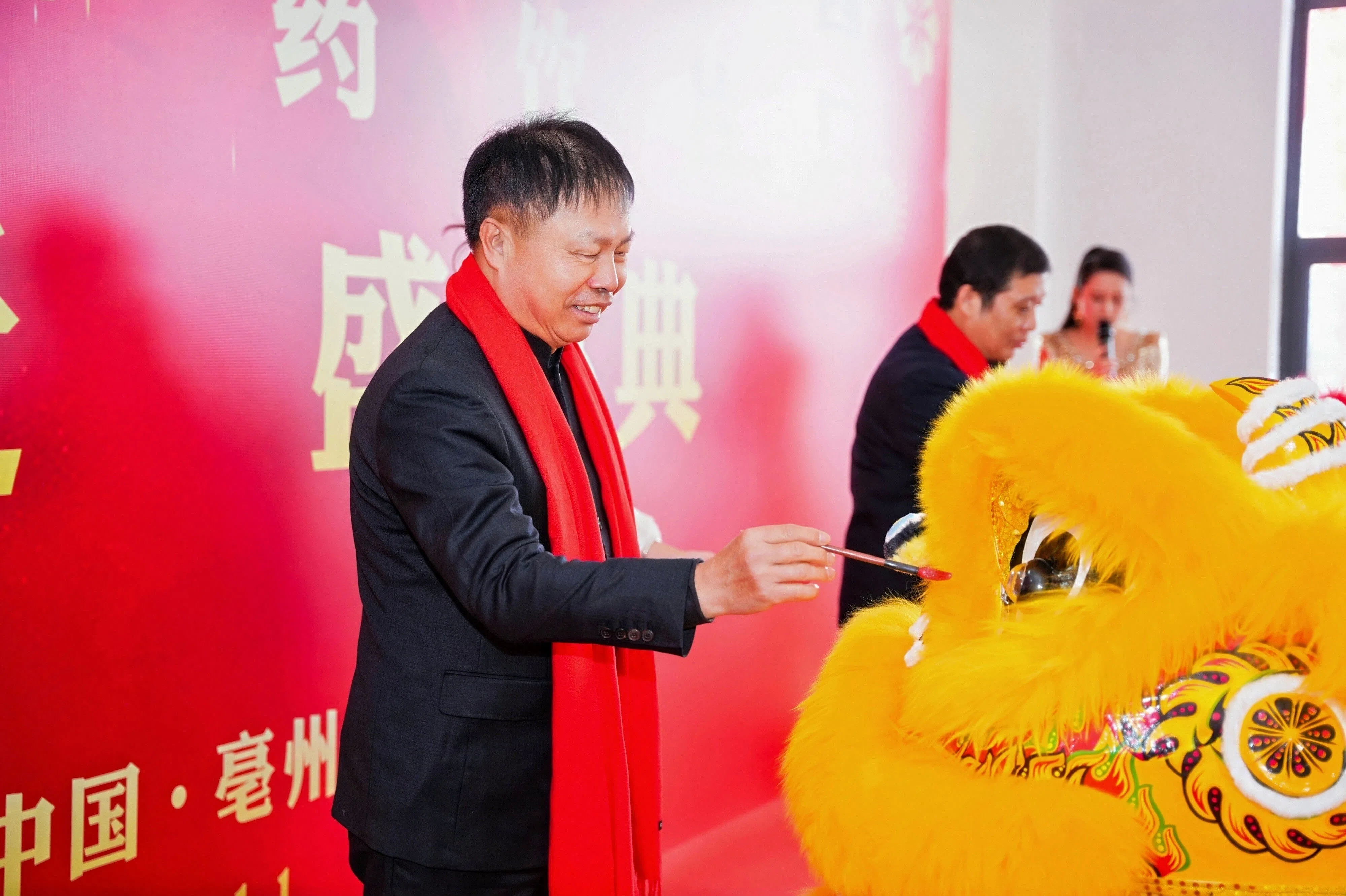 锣鼓震天,醒狮腾跃!鹭燕集团董事长吴金祥为祥狮点睛,狮眼生辉、瑞气满堂。
