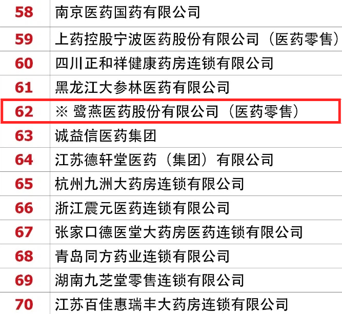 3月22日,《中国药店》揭晓了“2025-2026年度中国药店价值榜(100强)”。鹭燕医药股份有限公司(医药零售)连续六年登榜,排名第62位。